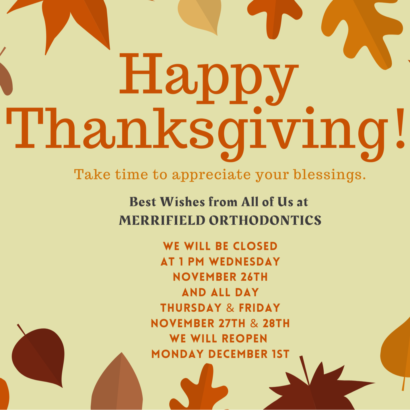 Gobble, gobble, it's Thanksgiving y'all! Happy Thanksgiving to you and your families. We hope you have a wonderful holiday. We will be closing a 1pm on Wednesday, November 26th and we will be closed all day Thursday, November 27th and Friday, November 28th. We will reopen on Monday, December 1st. Keep Smiling! #merrifieldorthodontics #merrifieldorthodonticsteam #mosmiles #mosmilesteam #bestteamever #itsthanksgivingyall #keepsmiling